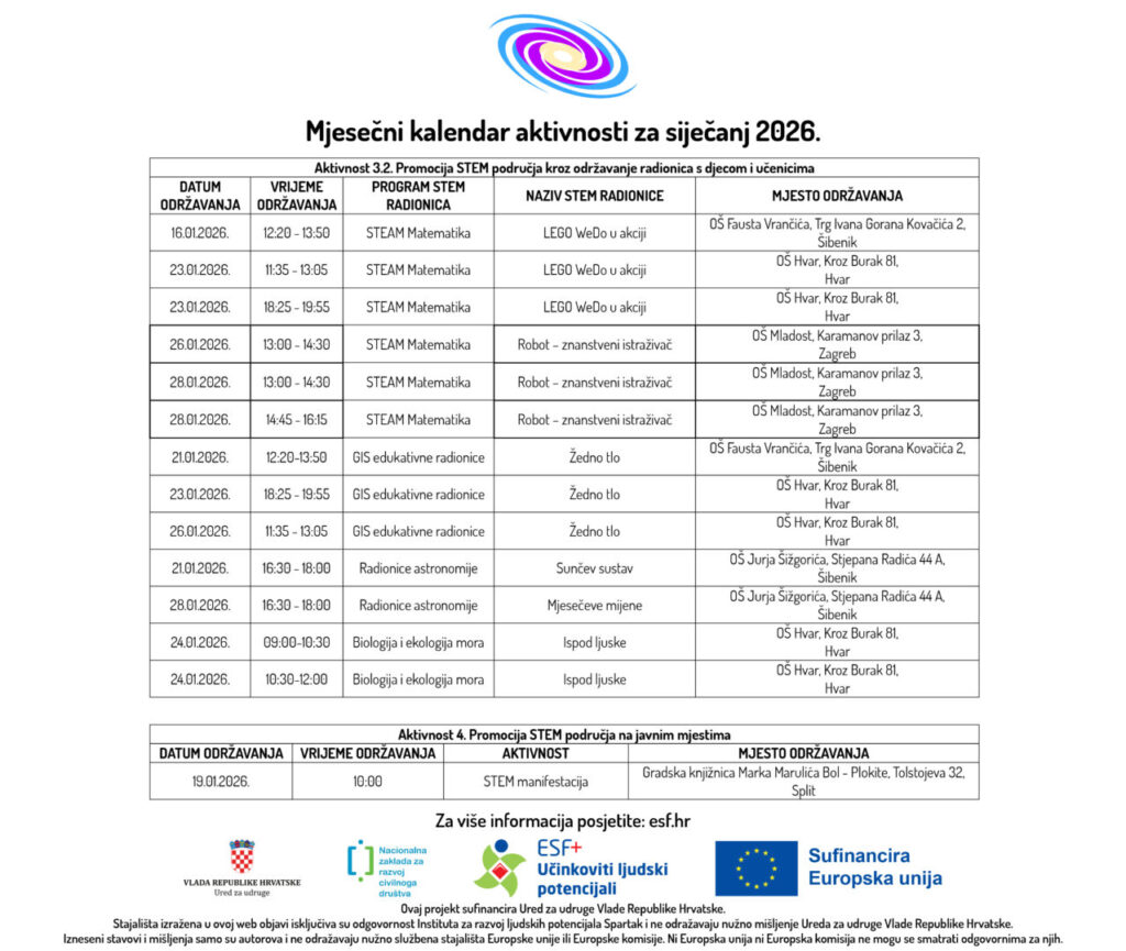 U prilogu možete pogledati Mjesečni kalendar aktivnosti za siječanj 2026. godine u sklopu ESF+ projekta „STEM Learning Network“ (SF.2.4.06.04.0081) ukupne vrijednosti od 297.557,55 eura, od čega bespovratna sredstva iznose 295.480,70 eura, a iznos EU sufinanciranja 251.158,59 eura. Provedba projekta će trajati u razdoblju od 20. ožujka 2025. do 20. ožujka 2027. godine. Prijavitelj je Institut za razvoj ljudskih potencijala Spartak. Partneri na projektu su: Krugovi, centar za edukaciju, savjetovanje i humanitarno djelovanje, Institut Ruđer Bošković, Sveučilište Algebra Bernays, Osnovna škola Hvar, Osnovna škola Pirovac, Osnovna škola Jakova Gotovca i Osnovna škola Mladost.
