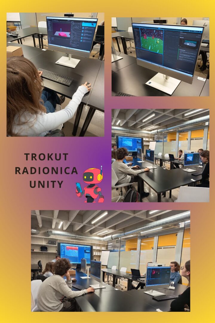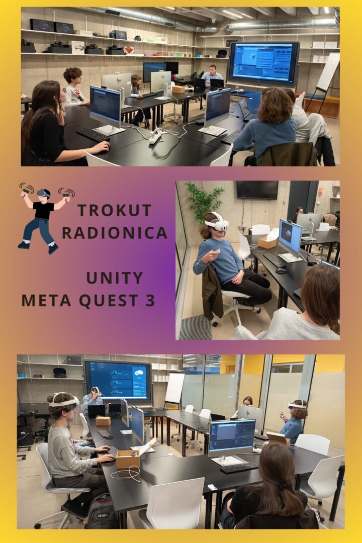 Učenici koji pohađaju izvannastavnu aktivnost INA Robotika posjetili su Trokut – Centar za nove tehnologije i poduzetništvo. Tijekom radionice upoznali su se s razvojnim okruženjem Unity, u kojem su stekli osnovna znanja o izradi računalne igre. Poseban naglasak bio je na radu u virtualnoj stvarnosti, pri čemu su učenici povezali Meta Quest 3 VR naočale s Unityjem te umetali 3D geometrijska tijela koja su mogli vidjeti i fizički manipulirati njima unutar virtualnog prostora.