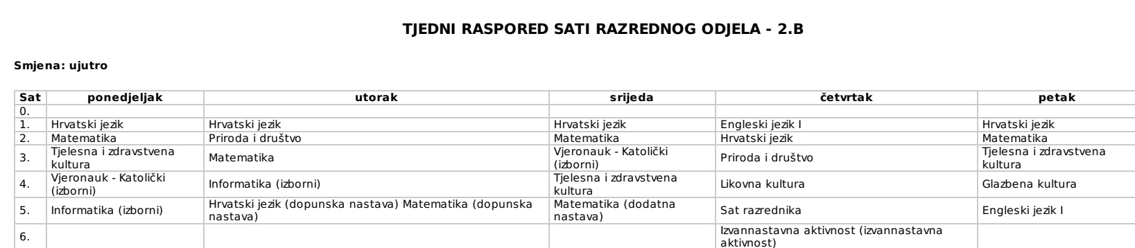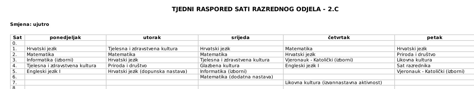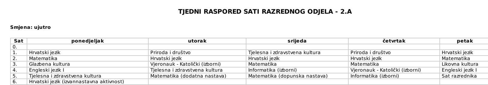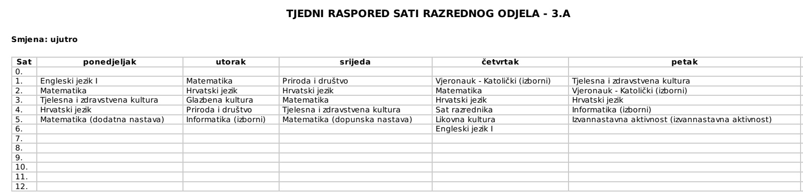 Raspored sati Raspored INA, dopunske, dodatne nastave, primanja roditelja 1. A razred Raspored 1. B razred Raspored 2. A razred Raspored 2. B razred Raspored 2. C razred Raspored 3. A razred Raspored 3. B razred Raspored 4. A razred Raspored 4. B razred Raspored Raspored sati 5.-8. razreda Raspored Poseban razredni odjel Raspored